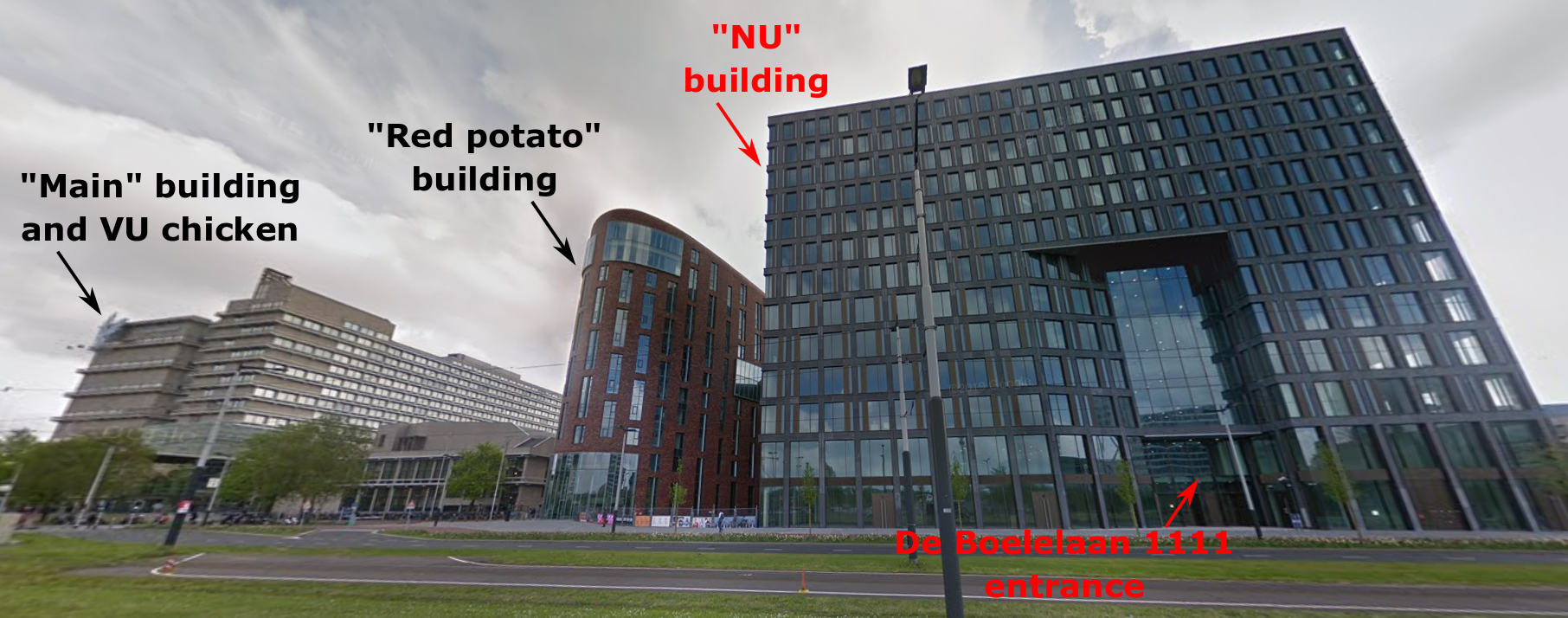 We are on the 11th floor of the “NU” building, at the Vrije Universiteit, Amsterdam. Google Maps points to the right location for the entrance to the building, on De Boelelaan 1111, 1081 HV.
